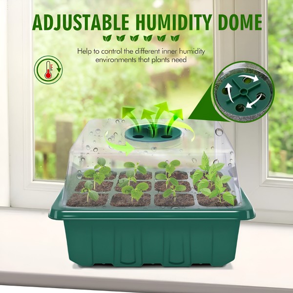 Minden tálcának 12 lyuka van, és egy fedéllel rendelkezik, amely szellőzőkapcsolóval van ellátva. Most szabályozhatja a páratartalom szintjét, és biztosíthatja a legjobb környezetet a palántáinak. Egészséges, jól szellőző gyökereket nevelhet az erősebb növények érdekében.